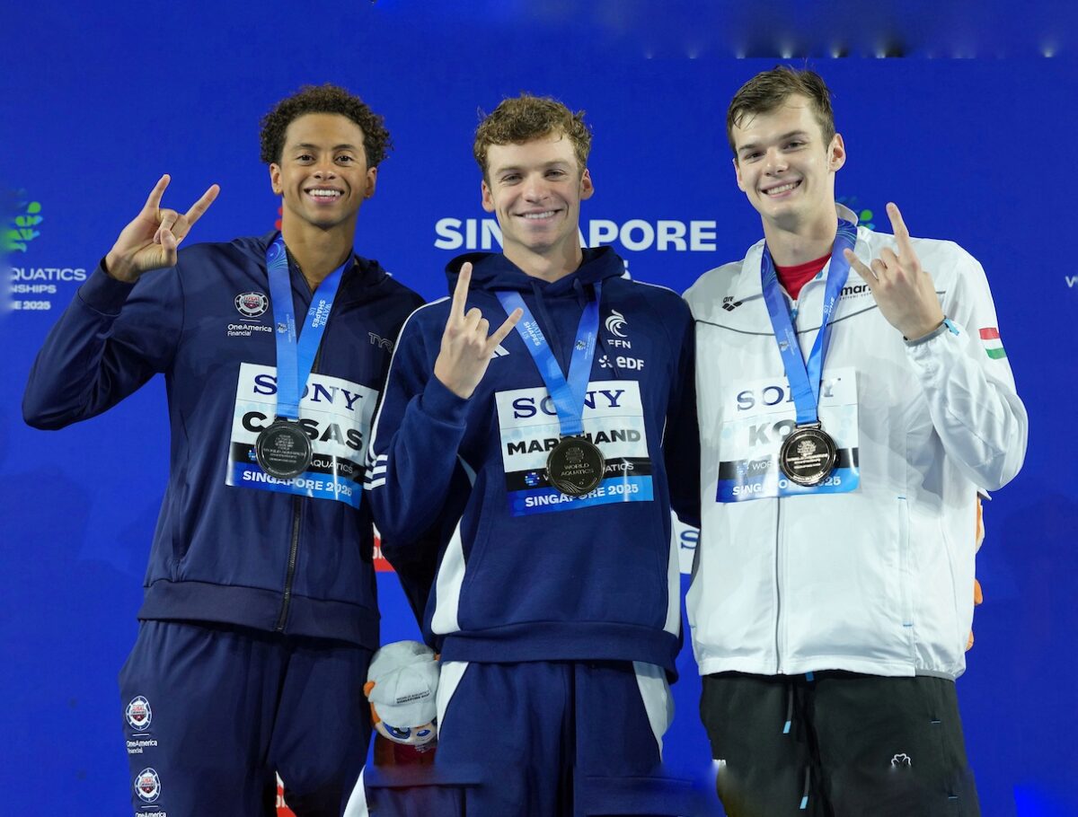 Kós Hubert először versenyzett edzőtársával, a négyszeres olimpiai- és ötszörös világbajnok, francia Léon Marchand-dal. Az amerikai Bob Bowman két tanítványa – akikhez egy harmadik Bowman-tanítvány, az amerikai Shaine Casas is csatlakozott – a 200 méteres vegyesúszásban mérte össze az erejét. De már a középfutamban kiderült, hogy ennek a számnak Marchand a koronázatlan királya, aki óriási világcsúcsot úszott, majd a döntőben is olyan tempót diktált, mellyel senki sem tudott lépést tartani. Kós Hubert azonban mindenképpen érmet szeretett volna nyerni, ezért nagyot küzdött, és végül új egyéni csúcsot felállítva harmadik helyen ért célba Marchand és Casas mögött. Ezzel megszerezte első érmét a szingapúri világbajnokságon. Nem sokkal később pedig fő számában, a 200 méteres hátúszás középdöntőjében állt rajthoz, mely versenyen harmadik legjobb idővel kvalifikálta magát a döntőbe. Kós számára nagyon fontos, hogy jól szerepeljen ebben a számban, ezért a 100 méteres pillangótól is visszalépett. Két nappal később világbajnoki címet nyert 200 méteres hátúszásban Zugló Díszpolgára a szingapúri vizes világbajnokságon, akinek óriási egyéni, országos és Európa-bajnoki csúcsot kellett úsznia az aranyéremért.
